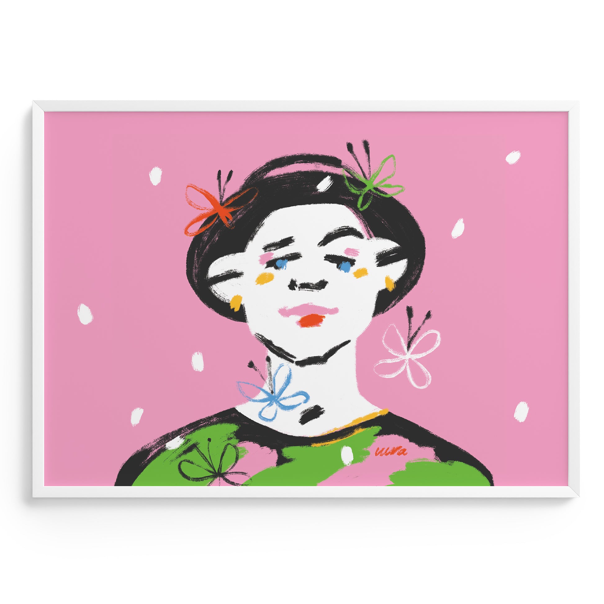 Une illustration douce mais graphique d'une figure stylisée et calme entourée de délicates papillons, sur un fond rose chaud. Les formes simples, les lignes texturées et les accents pastel donnent à la composition une qualité ludique et poétique. Ce poster décoratif s'intègre magnifiquement dans les chambres, les nurseries ou les espaces de vie baignés de lumière, ajoutant une touche de couleur douce et de charme.