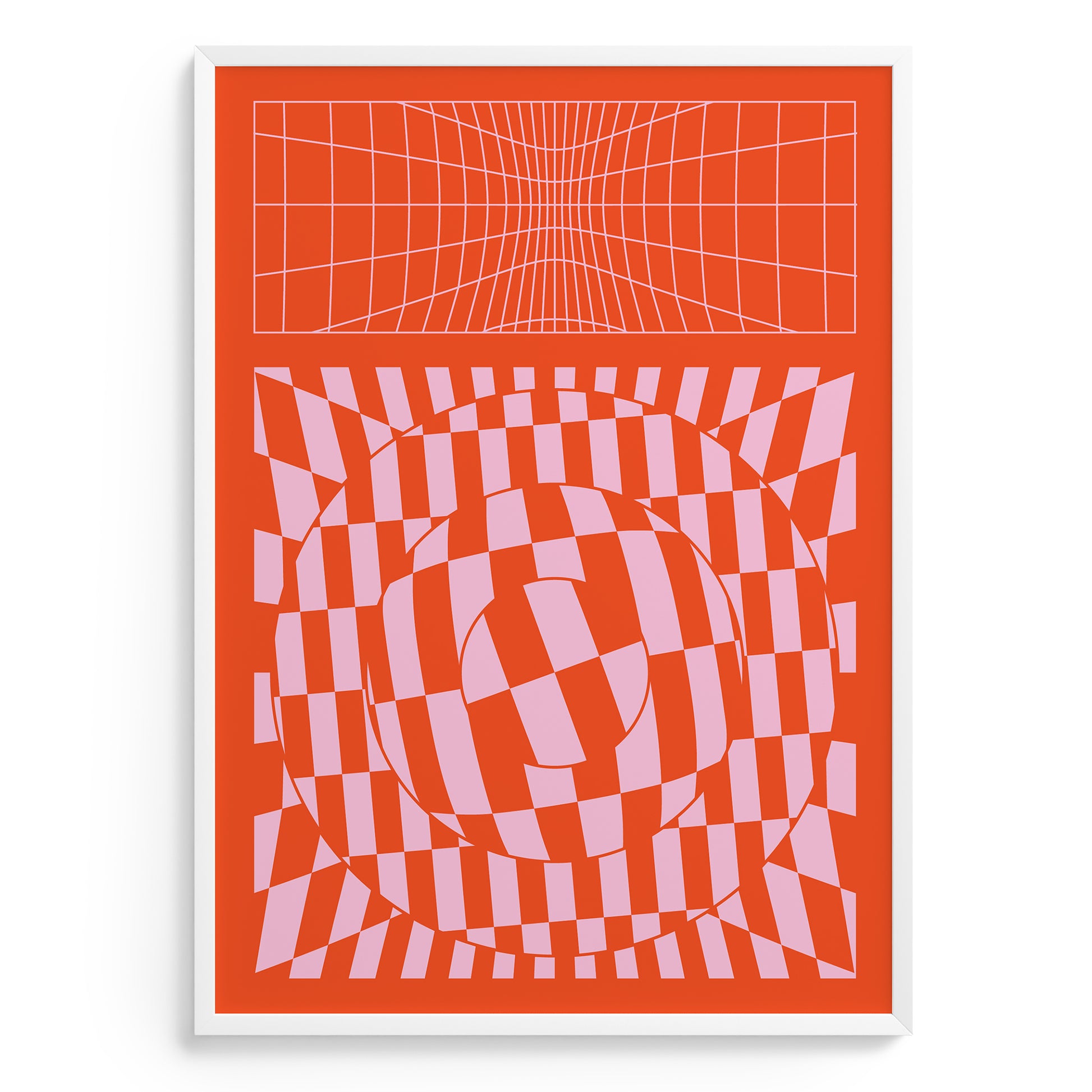 Ce poster Vyorä explore la distorsion géométrique à travers une composition orange audacieuse. Une grille blanche s'étire et se courbe vers le centre, créant une illusion d'optique hypnotique. La forme passe d'une grille rectangulaire structurée à un motif circulaire déformé, donnant à l'œuvre un sens du mouvement et de la profondeur.