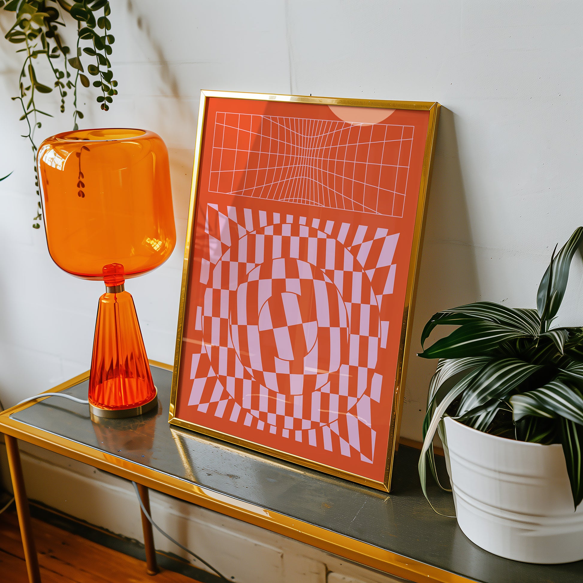 Le fort contraste entre l'orange et le blanc souligne la géométrie et rend le poster visuellement frappant tout en restant minimal. Le design graphique épuré fonctionne magnifiquement dans un intérieur moderne, ajoutant de l'énergie à un salon ou une chambre.