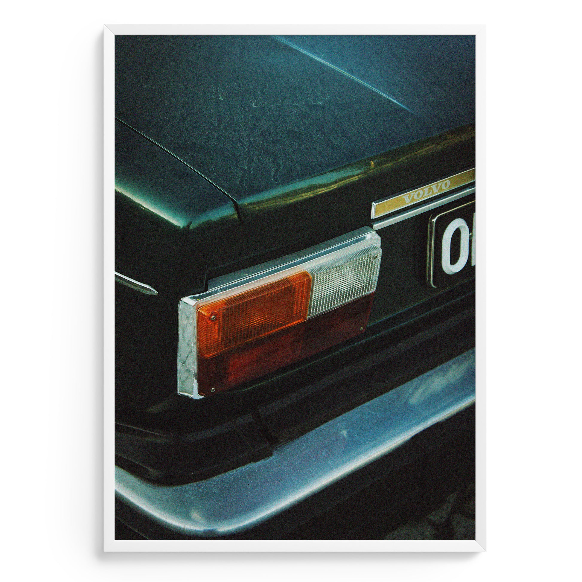 This photograph captures the timeless character of a classic Volvo. The composition focuses on the rear details, highlighting the deep forest-green paintwork, the geometric amber tail light, and the polished chrome bumper.