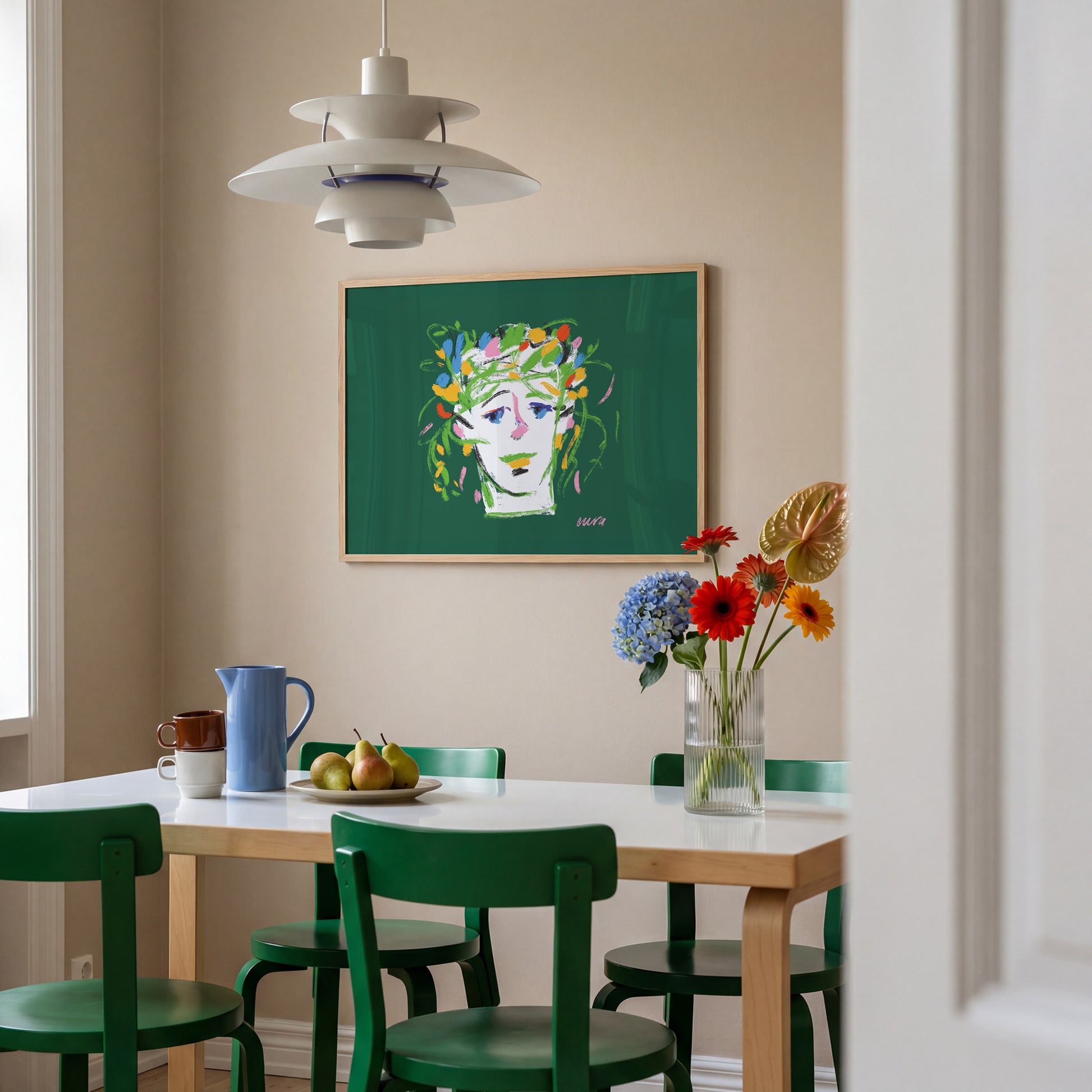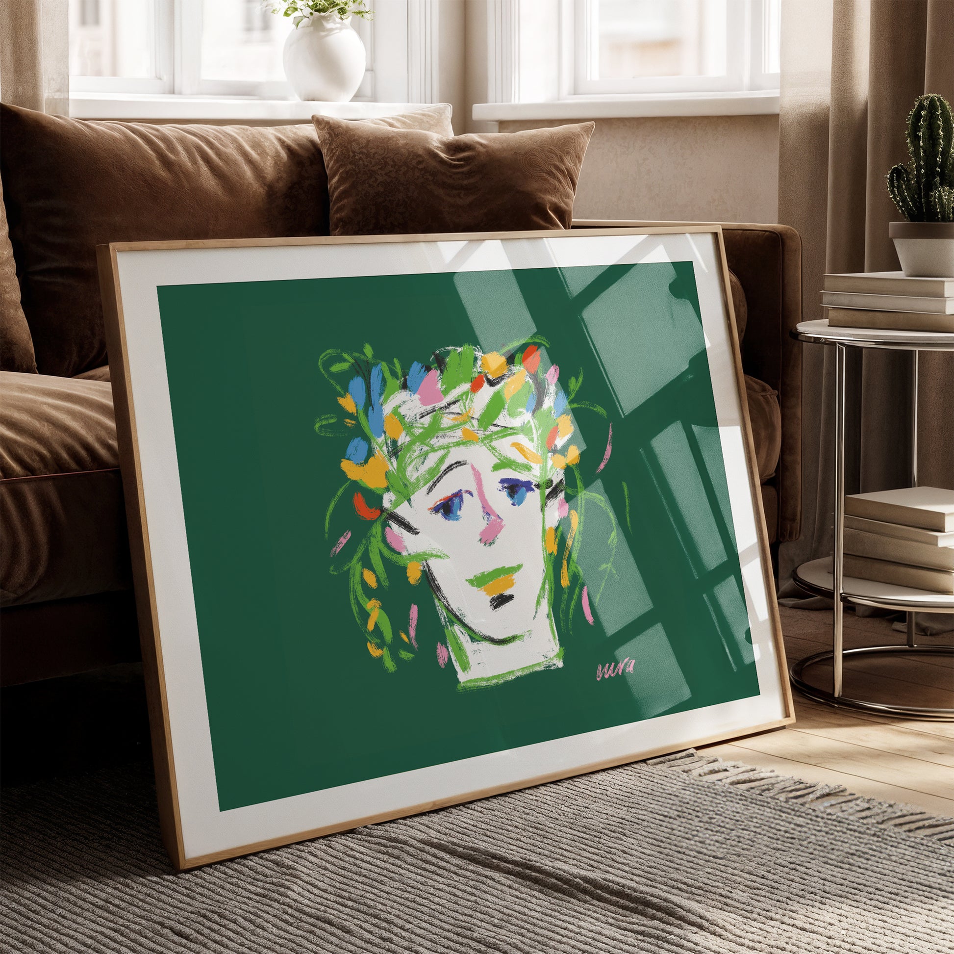 Uma vibrante impressão artística com um retrato estilizado coroado com flores silvestres, sobre um fundo verde escuro. Pinceladas expressivas e detalhes de cores vivas dão ao rosto um caráter animado e contemporâneo. Esta ilustração moderna combina motivos botânicos com uma composição gráfica e minimalista - perfeita como póster de destaque para uma sala de estar, quarto ou estúdio criativo.