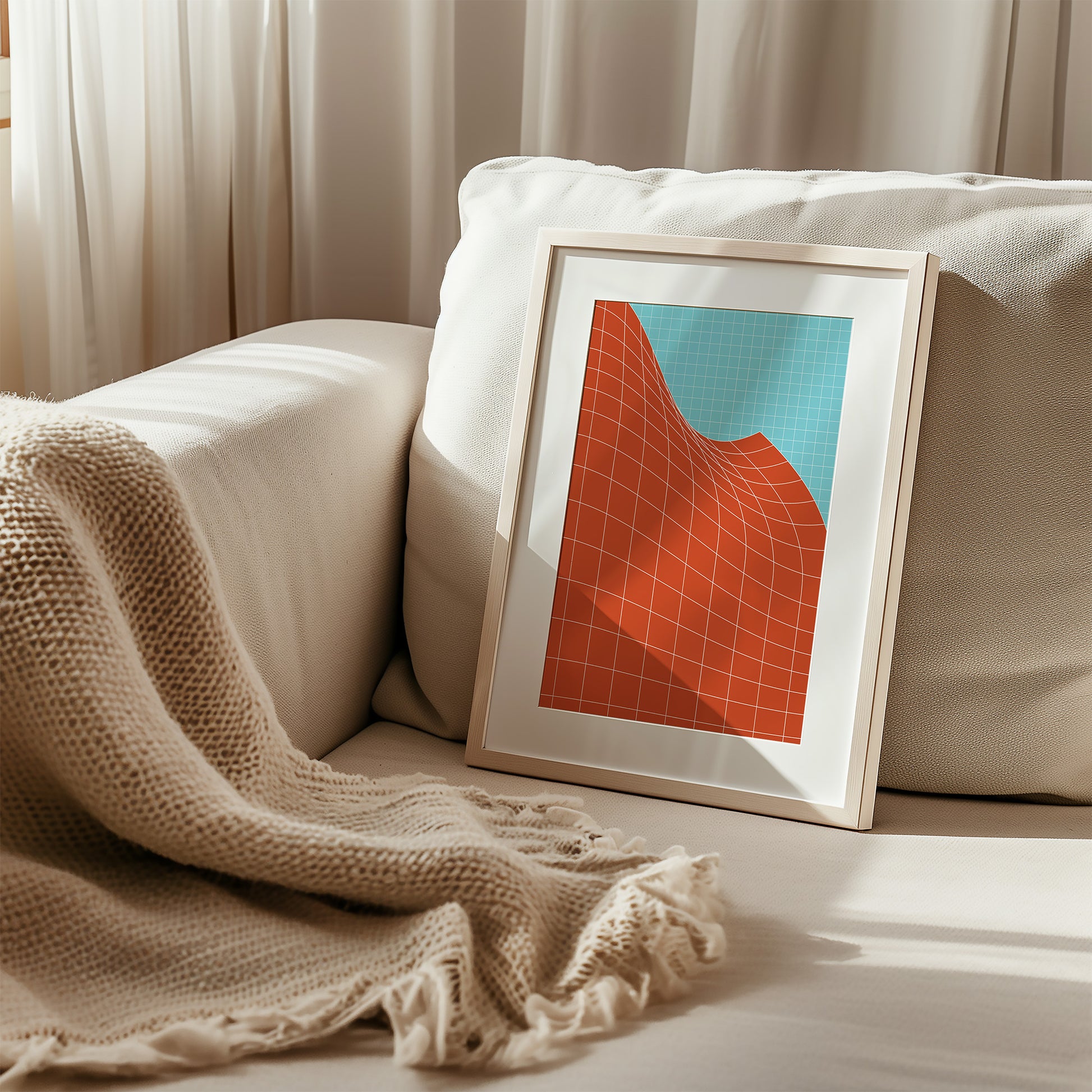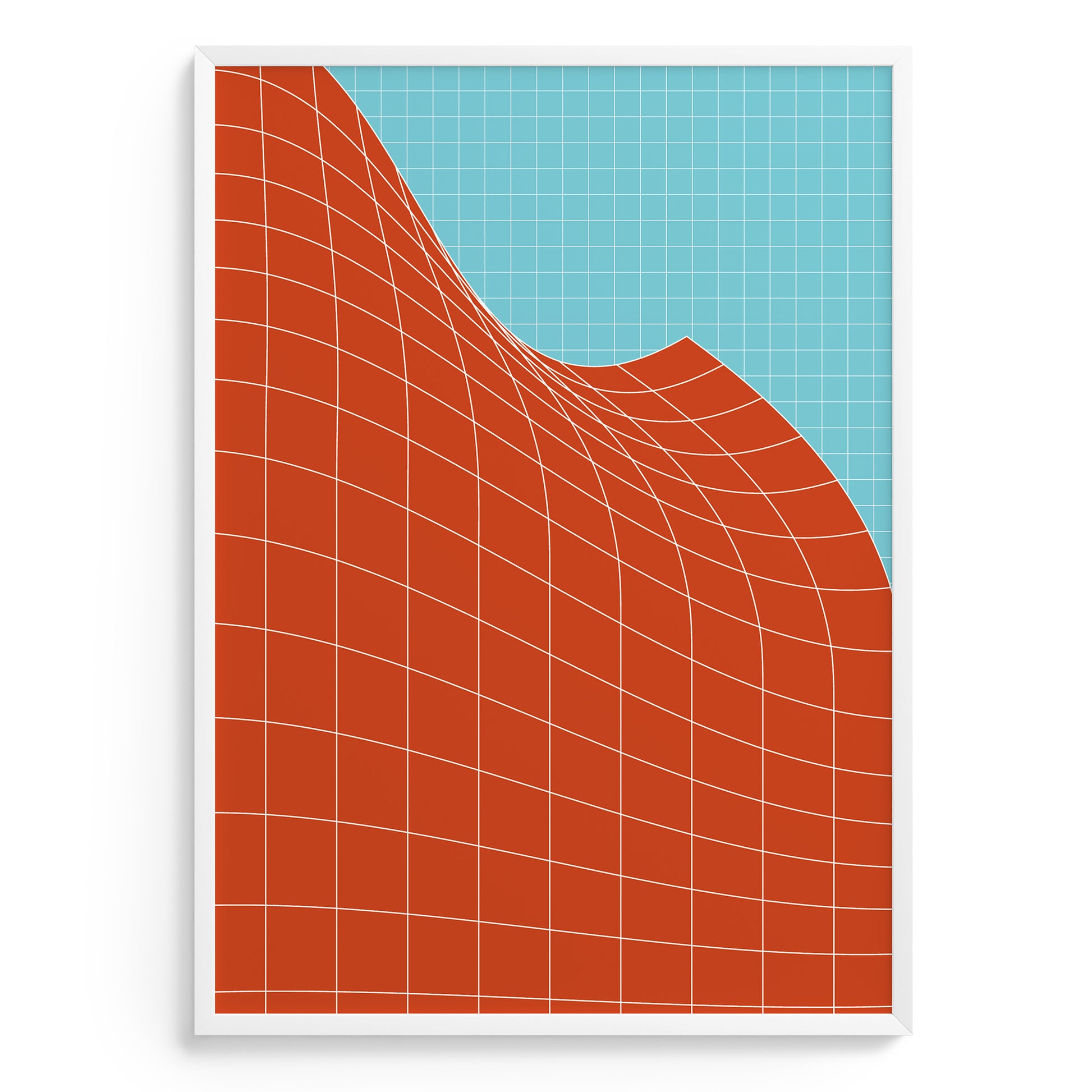 Este póster transforma uma simples grelha branca numa paisagem abstrata fluida. As linhas curvam-se suavemente sobre uma superfície laranja vibrante, criando a ilusão de ondas ou terreno digital.